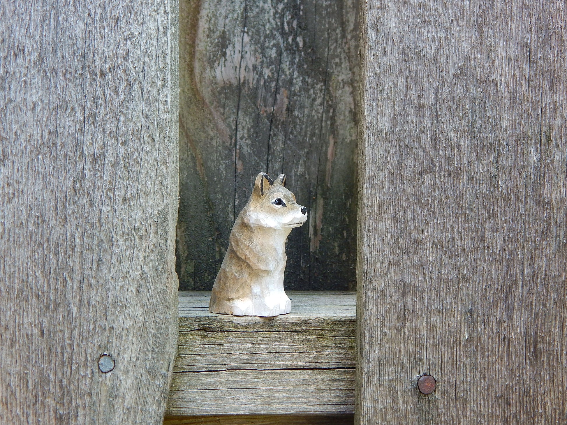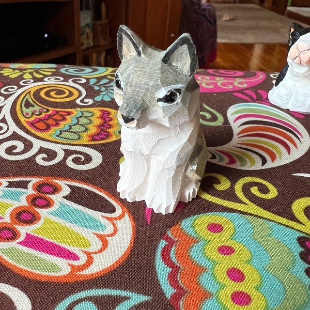 These are cute little wolves that measure about 2.5 inches. The wolves are carefully hand carved from 100% recycled Birch wood and hand-painted. The little eyes are also carefully made of glass. Each carving is unique, so there are small variations between each one.