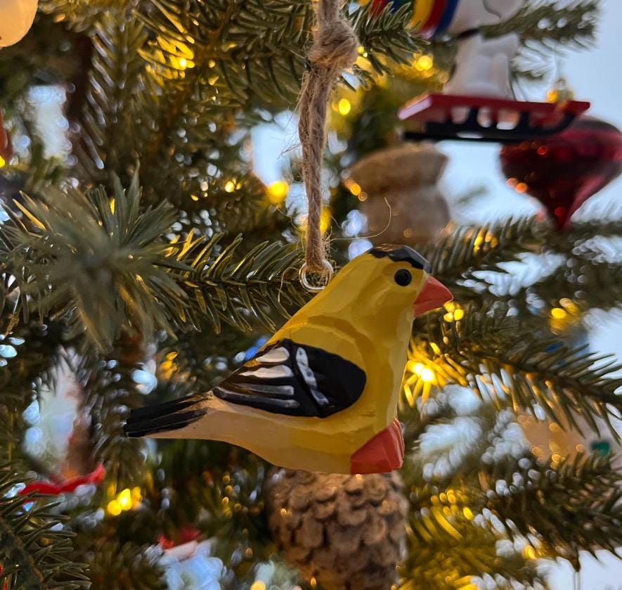 🐤 Hand-Carved Wooden American Goldfinch Ornament - Rustic Yellow Bird