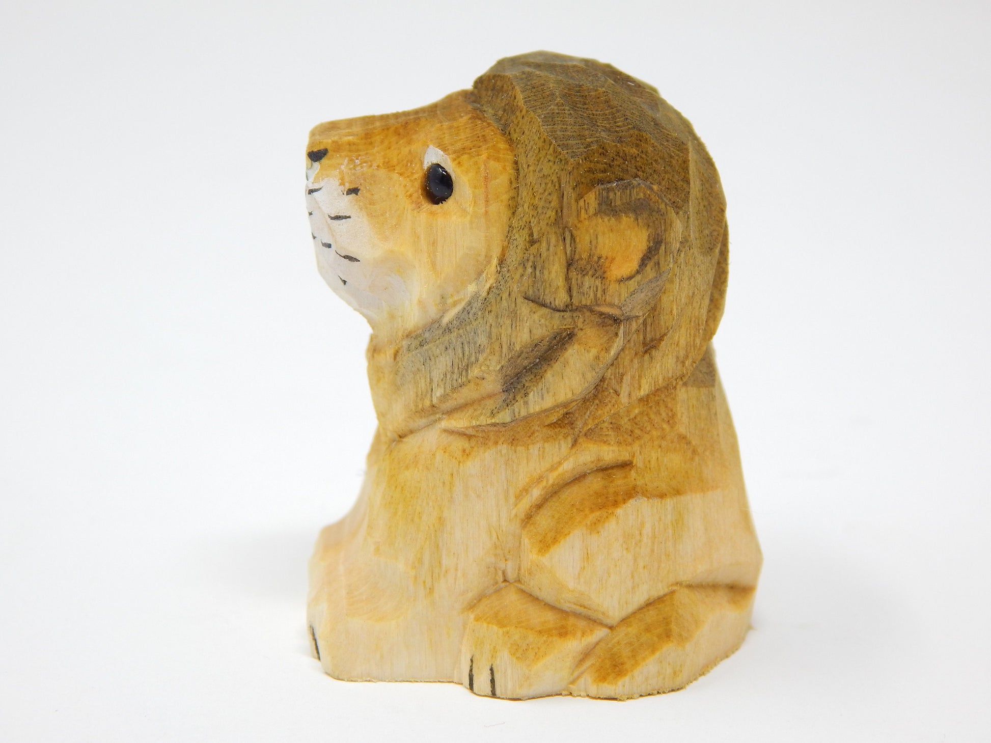 The lion is carefully carved from recycled wood and hand painted with vibrant colors that attempt to match nature's beauty. The little eyes are also carefully made of glass.