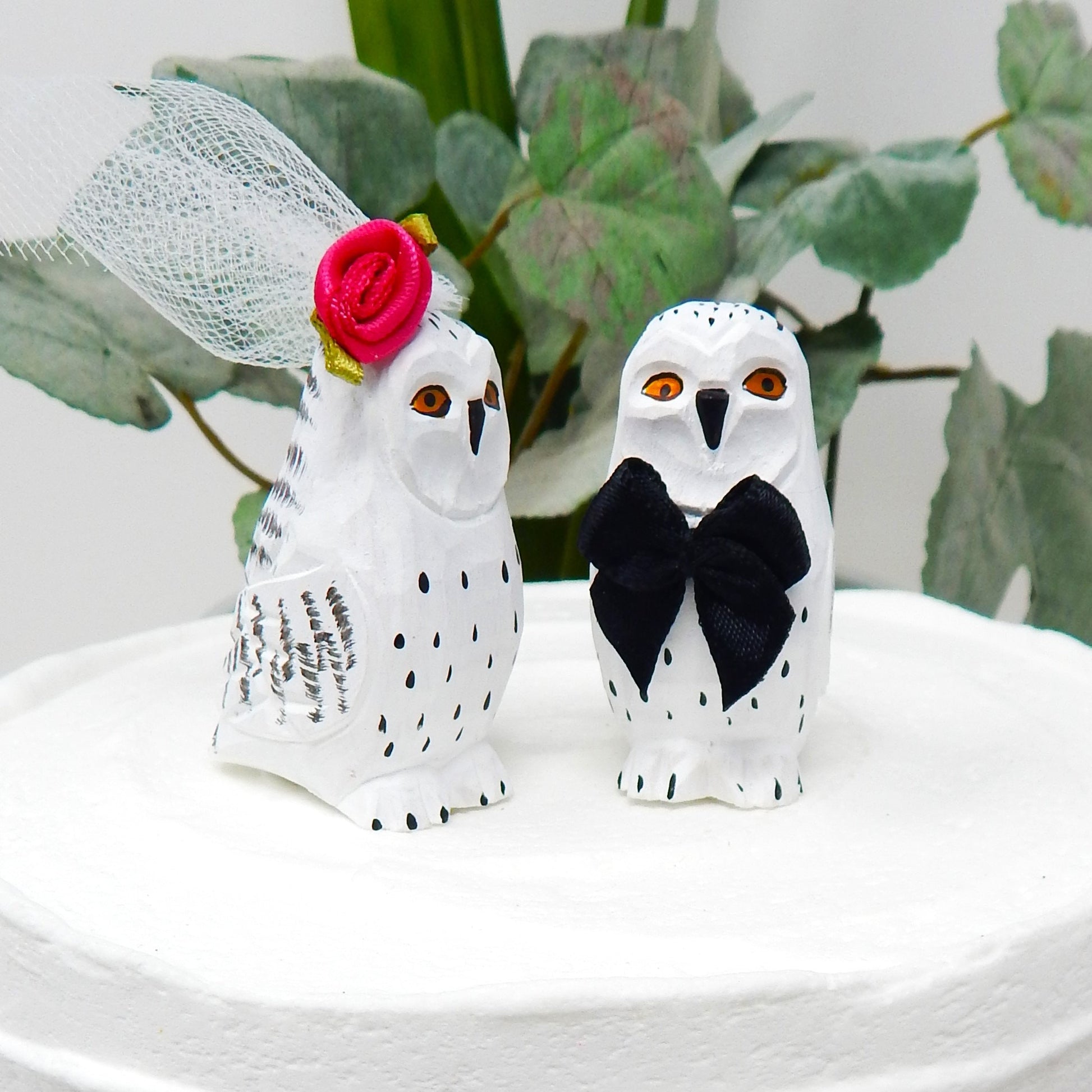 Snow Owl White Birds Cake Topper Bride & Groom Wedding Engagement Anniversary Carved Wood Statue